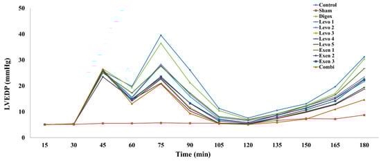 LVEDP is an important haemodynamic parameter which reflects the stiffness of the left ventricle. The main effect of time was found to be statistically significant (b = 0.248, p < 0.001). For every additional quarter, a 0.248 mmHg increase in LVEDP levels was observed. Regarding the groups, it was observed that groups Sham, Levo 1, Levo 2, Levo 3, Levo 4, Levo 5, Exen 1, Exen 2, Exen 3 and Combi had lower LVEDP levels compared to the control group (Table 2, Figure 4) and therefore less myocardial stiffness. The pairwise comparison between the Levo and the Exen groups showed that there were no statistically significant differences between the groups (p < 0.999). The regression analysis between the different types of groups over time showed that the main effect of time was found to be non-statistically significant (b = 0.078, p = 0.484). Additionally, the Exen 2 group (p = 0.019) had higher LVEDP levels compared to the Combi group. Levo 3 also presented higher levels of LVEDP, but these were, however, statistically insignificant (p = 0.128).