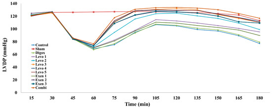 The LVDP is the most significant haemodynamic parameter in isolated heart models as it does more accurately demonstrate the haemodynamic performance of the heart. Concerning the LVDP values, the main effect of time was found to be statistically significant (b = 0.348, p = 0.011); specifically, for every additional quarter, a 0.348 mmHg increase in LVDP levels was observed. Sham, Levo 1, Levo 2, Levo 3, Levo 4, Levo 5, Exen 2, Exen 3 and Combi had higher LVDP levels compared to the control group (Table 3, Figure 5). The pairwise comparison showed that Levo 1 presented lower LVDP levels compared to Levo 2 (p = 0.001), Levo 2 presented lower LVDP levels compared to Levo 3 (p = 0.008) and the Exen 1 group presented lower LVDP levels compared to Exen 2 (p < 0.001). The regression analysis used to assess the effect of group and time on LVDP regarding the three main groups (Levo 3, Exen 2 and Combi) showed that the main effect of time was statistically significant (b = 1.452, p < 0.001); specifically, for every additional quarter, a 1.452 mmHg increase was observed. Levo 3 (p = 0.030) and Exen 2 (p = 0.015) presented lower LVDP levels compared to the Combi group.