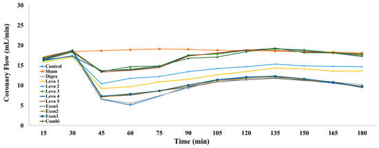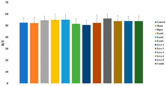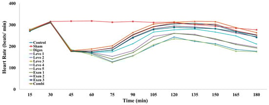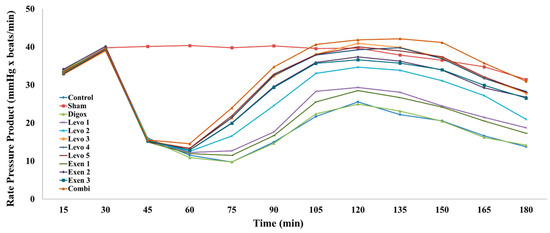 RPP is a parameter which demonstrates the stress put on the cardiac muscle based on the number of times it needs to beat per minute (HR) and the systolic blood pressure that it is pumping against (LVSP). The main effect of time here was found to be statistically insignificant (b = 0.103, p = 0.144). Sham, Levo 1, Levo 2, Levo 3, Levo 4, Levo 5, Exen 2, Exen 3 and Combi had significantly higher RPP compared to the control group (Table 5, Figure 7). Levo 1 presented lower RPP levels compared to Levo 2 (p = 0.003), Levo 2 lower compared to Levo 3 (p = 0.001) and Exen 1 lower compared to Exen 2 (p < 0.001). Regarding the main groups, the main effect of time was found to be statistically significant (b = 0.786, p < 0.001). It was observed that the groups Levo 3 (p = 0.050) and Exen 2 (p = 0.011) presented lower RPP levels compared to the Combi group.