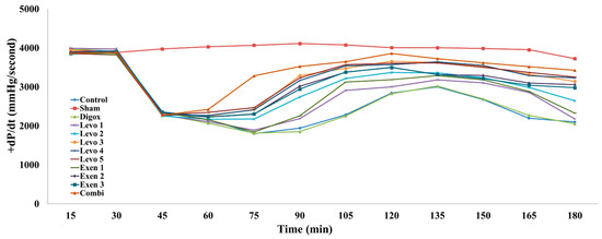 +dP/dt is a sensitive indicator of changes in cardiac contractility given the fact that parameters such as preload, afterload and heart rate are well-controlled. The main effect of time between the +dP/dt and different types of groups was statistically significant (b = −15.652, p = 0.001). For every additional quarter, a 15.652 mmHg decrease in +dP/dt levels was observed. Sham, Levo 2, Levo 3, Levo 4, Levo 5, Exen 1, Exen 2, Exen 3 and Combi presented higher +dP/dt levels compared to the control group (Table 6, Figure 8). Levo 1 presented lower levels compared to Levo 2 (p = 0.033), Levo 2 presented lower levels compared to Levo 3 (p = 0.005) and Exen 1 presented lower +dP/dt compared to Exen 2 (p = 0.004). Additionally, the main effect of time between the main groups was found to be statistically significant (b = 17.944, p = 0.051). Levo 3 (p = 0.026) and Exen 2 (p = 0.018) presented lower +dP/dt levels compared to the Combi group.