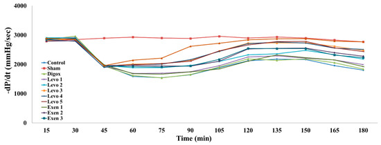 Furthermore, the data showed that the main effect of time regarding −dP/dt was found to be statistically significant (b = −8.588, p = 0.003); specifically, for every additional quarter a 8.588 mmHg decrease in −dP/dt levels was observed. Sham, Levo 2, Levo 3, Levo 4, Levo 5, Exen 2, Exen 3 and Combi presented higher −dP/dt levels compared to the control group (Table 7, Figure 9). In addition, Levo 1 presented lower −dP/dt levels compared to Levo 2 (p = 0.011), Levo 2 presented lower −dP/dt levels compared to Levo 3 (p = 0.012) and the Exen 1 group presented lower levels compared to Exen 2 (p = 0.004). The main effect of time was found to be statistically significant for the main groups (b = 18.147, p < 0.001). It was observed that Levo 3 and Exen 2 presented lower −dP/dt levels compared to the combi group (p < 0.001).
