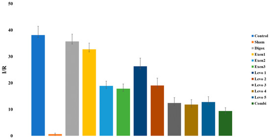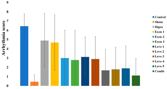 A one-way ANOVA was performed to assess possible differences in arrhythmia score among groups. There was a significant main effect of group (F = 4.798, p < 0.001) (Table 9 and Table 10). In order to examine whether there are any statistically significant differences between the main groups, extra pairwise comparison was conducted. The results showed that the control group presents higher score compared to Combi, Sham, Levo 1, Levo 2, Levo 3, Levo 4, Levo 5, Exen 2 and Exen 3. Moreover, no statistically significant differences were found between the Levo and Exen groups. Additionally, no statistically significant differences were found between the Combi group versus Levo 3 (p = 0.480) and Exen 2 (p = 0.091) (Figure 11).