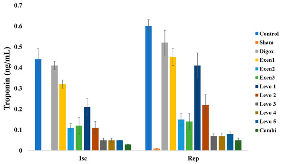 Troponin is the most reliable and sensitive marker to assess the onset and evolution of the myocardial infarction. The main effect of time was found to be statistically significant on troponin levels (b = 0.073, p < 0.001). Sham, Digox, Levo 1, Levo 2, Levo 3, Levo 4, Levo 5, Exen 1, Exen 2, Exen 3 and Combi presented lower troponin levels compared to the control group (Table 11, Figure 12). Levo 1 presented higher levels compared to Levo 2 (p < 0.001), Levo 2 presented higher levels compared to Levo 3 (p < 0.001) and the Exen 1 presented higher levels compared to Exen 2 (p < 0.001). Regarding the main groups, the main effect of time was found to be statistically significant (b = 0.026, p < 0.001). Levo 3 (p = 0.010) and Exen 2 (p < 0.001) presented higher levels compared to Combi group.