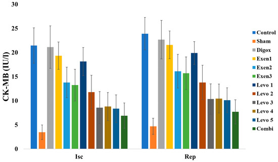 CK-MB is a classical marker of myocardial injury. The main effect of time was found to be statistically significant on CK-MB levels (b = 1.833, p < 0.001). Sham, Levo 1, Levo 2, Levo 3, Levo 4, Levo 5, Exen 1, Exen 2, Exen 3 and Combi presented lower CK-MB levels compared to the control group (Table 12, Figure 13). Levo 1 presented higher levels compared to Levo 2 (p < 0.001), Levo 2 presented higher levels compared to Levo 3 (p = 0.002) and Exen 1 presented higher levels than Exen 2 (p < 0.001). Finally, Exen 2 (p < 0.001) and Levo 3 presented higher levels than Combi (p = 0.011).