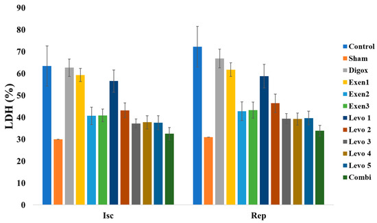 Regarding the LDH levels, the main effect of time was found to be statistically significant (b = 2.796, p < 0.001). Sham, Digox, Levo 1, Levo 2, Levo 3, Levo 4, Levo 5, Exen 1, Exen 2, Exen 3 and Combi presented lower LDH levels compared to the control group (Table 13, Figure 14). Additionally, Levo 1 presented higher LDH levels compared to Levo 2 (p < 0.001), Levo 2 presented higher levels than Levo 3 (p < 0.001) and Exen 1 higher levels than Exen 2 (0 < 0.001). Levo 3 and Exen 2 also present higher LDH levels compared to the combi group (p < 0.001).