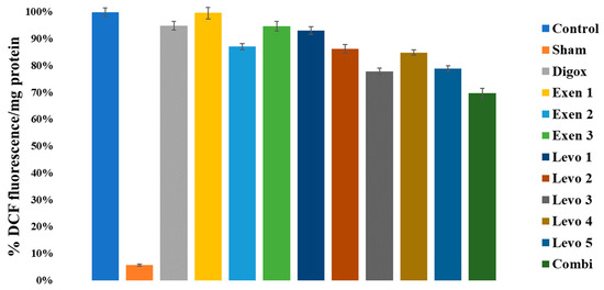 Evaluation of oxidative stress. Homogenization of heart tissue was performed mechanically in a mortar placed on ice. The lysis of the cells was done with the appropriate buffer which contained inhibitors that prevent proteolysis, dephosphorylation and denaturation of the samples, and the whole process was carried out strictly on ice to avoid the destruction of the protein extract. A horizontal incision was made in order to have a representative sample from the entire length of the tissue. The tissue section was placed in an Eppendorf tube and weighed to achieve a final tissue weight of 0.03 g, according to the homogenization protocols. Then, the tissue was transferred to a special homogenizing mortar, where 500 mL of immunoprecipitation lysis buffer (RIPA) solution were added. In order to maximize the amount of protein extract, the tissue was incubated with RIPA solution for 30 min and then crushed. All procedures were performed strictly on ice. RIPA solution contains sodium dodecyl sulfate (SDS) detergent for membrane rupture and protease inhibitors to inhibit protein degradation. The homogenized tissue was transferred to a centrifuge tube. Centrifuging at 20,000× g for 30 min at 4 °C followed. The supernatant was transferred to a new sterile Eppendorf tube for the determination of total proteins in the sample by the Bradford method. Accumulation of active oxygen radicals (ROS) was measured with the reagent 5-(and-6)-carboxy-2′,7′-(dichloro-dihydro)-diaketo-fluorescein (carboxy-H2DCFDA, Fluka Chemical, Milwaukee, WI, USA). This is an ester that penetrates the membrane, is non-fluorescent and sensitive to redox. Once this reagent is oxidized by intracellular oxygen radicals, the resulting product, carboxy-DCF, emits green fluorescence. DCF fluorescence was measured in a special instrument called a fluorescence meter [39]. The accumulation of ROS in the extracts that emerged after the homogenization of the heart tissues, was measured here with the DCFDA cellular ROS assay kit according to the following procedure: