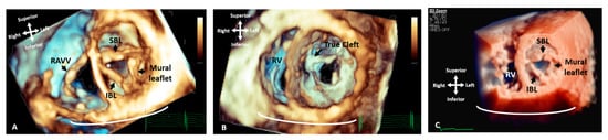 Three-dimensional TTE comparing the appearance of a LAVV and a true mitral valve cleft. (A) A LAVV demonstrating the zone of apposition (asterisk) compared to (B) a true cleft of the AMVL, both demonstrated with rendered 3D imaging and (C) illustrates the greater degree of resolution that can be appreciated in the structures with True Vue imaging modality. The images are depicted in anatomical orientation from the ventricular aspect. AMVL: Anterior mitral valve leaflet; IBL: Inferior bridging leaflet; RV: Right ventricle; RAVV: Right atrioventricular valve and SBL: Superior bridging leaflet.