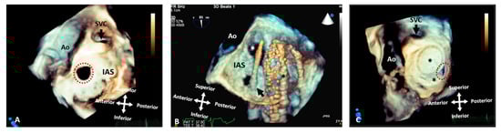 3D TOE provides additional information during elective or pre-procedural imaging of selected patients and has led to advances in interventional procedures. There is an ever-growing group of TOE-guided procedures where 3D echocardiography facilitates both appropriate patient selection and also intra-procedural guidance and decision making. Real-time 3D imaging is recommended for visualization of catheters, delivery systems, and identifying device position, any residual shunt and the relationship of the device to adjacent structures []. Three-dimensional TOE has an established role in ASD device closure, since it can provide a precise delineation of the anatomic defect and investigate its suitability for device closure [] (Figure 6). One study has demonstrated 54% reduction in total fluoroscopic time and 78% radiation reduction in ASD closures using 3D TOE guidance with no associated complications [].