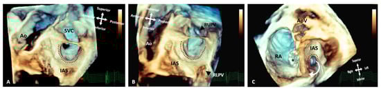 - Kabir, S.R.; Simpson, J.M.; Jones, M.I.; Butera, G.; Qureshi, S.A.; Rosenthal, E. TEE Guidance During Transcatheter Treatment of Superior SVASDs With PAPVD. JACC Cardiovasc. Imaging 2021, 15, 160–167. [Google Scholar] [CrossRef] [PubMed]