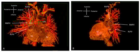 Three-dimensional rendered images from CT, demonstrating the appearance of Superior Sinus Venosus ASD. (A) Demonstrates a superior sinus venosus ASD as outlined by the dashed line—seen from the right atrial aspect. RUPV and RMPV drain anomalously to the SVC. RLPV can be seen draining to LA. (B) Depicts a superior sinus venosus ASD from the left atrial aspect, allows imaging of the anomalous drainage of the RUPV and RMPV to the SVC. RLPV illustrated draining into the LA. LA: Left atrium; LPA: Left pulmonary artery; LV: Left ventricle; RA: Right atrium; RV: Right ventricle; SVC: Superior vena cava; RLPV: Right lower pulmonary vein; RMPV: Right middle pulmonary vein; RUPV: Right upper pulmonary vein.