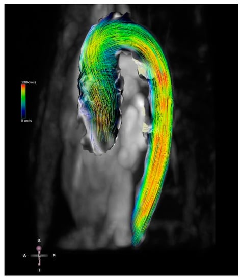 Four-dimensional flow image of a patient with a bicuspid aortic valve and dilation of the ascending aorta. Streamlines show the 4D flow dataset in mid-systole. Streamlines represent the direction of the flow and are colour-coded for velocity.