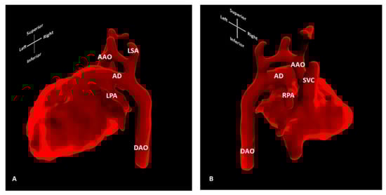 Three-dimensional foetal cardiac MRI showing high suspicion of CoA. Segmentation of motion-corrected 3D foetal cardiac MRI data, showing (A) left lateral and (B) right lateral view of the foetal heart. Foetal cardiac MRI was conducted at 30 + 2 weeks’ gestation for suspected coarctation of the aorta. Neonatal coarctation requiring surgical repair was confirmed after birth. AAO: Ascending aorta; AD: Arterial duct; DAO: Descending aorta; LPA: Left pulmonary artery; LSA: Left subclavian artery; RPA: Right pulmonary artery; SVC: Superior vena cava.