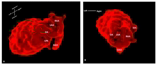 Three-dimensional foetal cardiac MRI showing a double aortic arch. Segmentation of motion-corrected 3D foetal cardiac MRI data, showing (A) superior and (B) oblique left lateral/superior view of the foetal heart. Foetal cardiac MRI was conducted at 32 + 4 weeks’ gestation for suspected double aortic arch. Surgical findings confirmed the presence of a smaller left aortic arch in addition to dominant right aortic arch and left arterial duct. AD: Arterial duct; DAO: Descending aorta; LAA: Left aortic arch; LPA: Left pulmonary artery; RAA: Right aortic arch; SVC: Superior vena cava.