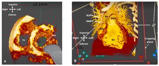 Three-dimensional rendered imaging in virtual reality. (A) 3D TOE image viewed from ventricular apex, demonstrating view of the mitral and tricuspid valves. A measurement of the mitral valve annulus has been performed using the in-built tool. (B) CT demonstrating a case of Superior Sinus Venosus ASD. The cropping plane (dashed arrow) is cropping into the volume from the anterior plane and demonstrating the entry points of the RUPV and RMPV into the SVC (arrows). Ao: Aorta; MPA: Main pulmonary artery; MV: Mitral valve; RAA: Right atrial appendage; RMPV: Right middle pulmonary vein; RUPV: Right upper pulmonary vein; RV: Right ventricle; SVC: Superior vena cava; TV: Tricuspid valve.