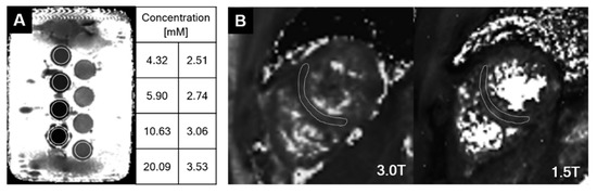 - Suh, Y.J.; Kim, P.K.; Park, J.; Park, E.A.; Jung, J.I.; Choi, B.W. Phantom-based correction for standardization of myocardial native T1 and extracellular volume fraction in healthy subjects at 3-Tesla cardiac magnetic resonance imaging. Eur. Radiol. 2022. [Google Scholar] [CrossRef] [PubMed]