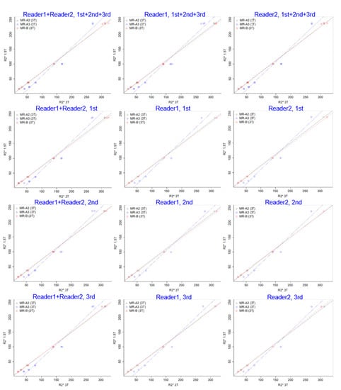 The linear association between R2* values at 1.5T and 3T was found with good fit, but a different relationship was observed according to the MR scanners (MR-A2, R2*1.5T = 0.76 × R2*3.0T − 2.23, R2 = 0.999; MR-A3, R2*1.5T = 0.95 × R2*3.0T − 34.28, R2 = 0.973; MR-B, R2*1.5T = 0.76 × R2*3.0T − 3.02, R2 = 0.999; Table 2, Figure 2).