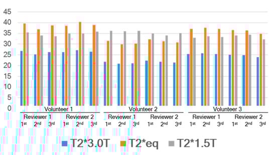 From the in vivo study with the normal myocardium, no significant susceptibility artifacts were found in the interventricular septum. T2* values ranged from 32.26 to 36.26 at 1.5T scanners and from 20.87 to 27.26 at 3T scanners. The mean and standard deviation of T2*1.5T and T2*eq were 34.5 ± 1.2 (range, 32.3–36.3) and 35.5 ± 3.5 (range, 29.9–40.2), respectively, without any significant statistical difference (p = 0.340, Table 4, Figure 3). In addition, there were no significant differences for each reader or each measurement.