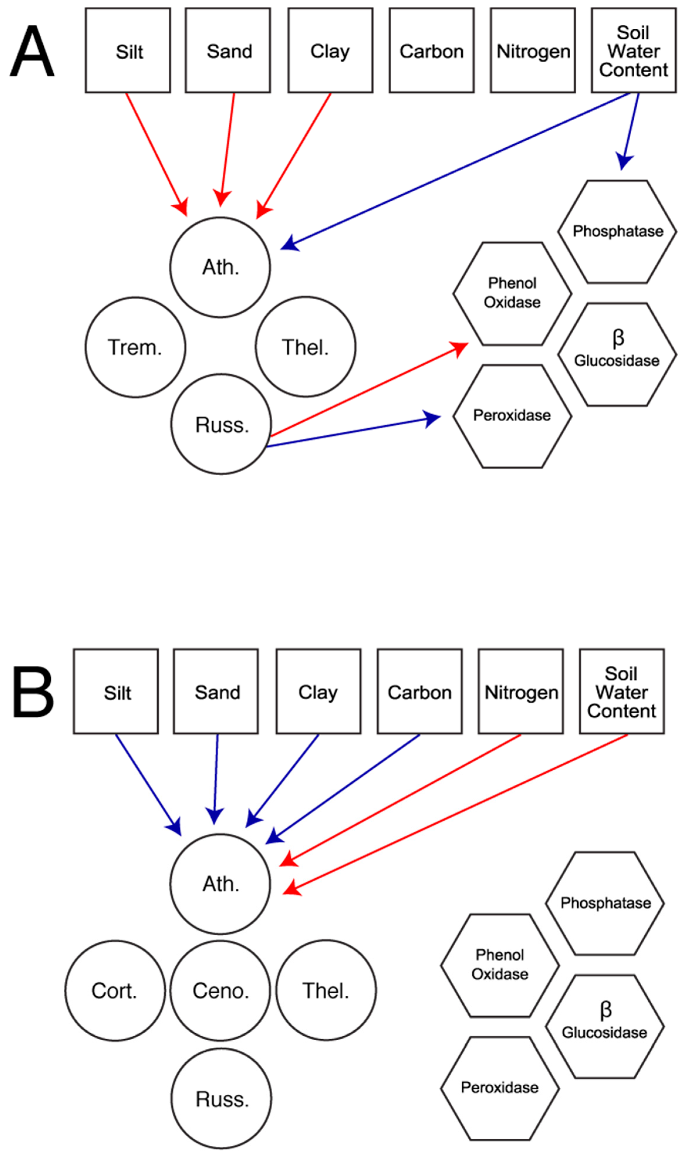 Most parsimonious piecewise structural equation model for full models of the Field (A) and Forest (B), exploring the effect of environmental variables (squares) on all present ectomyocrrhizal fungi (circles; Ath. = Atheliceae, Ceno. = Cenococcum, Cort. = Cortinariaceae, Russ. = Russulaceae, Thel. = Thelephoraceae, Trem. = Tremellaceae) or extracellular enzymes (hexagons). Enzymes could also be directly modified by environmental variables. Arrows indicate direction of effect. Only significant interaction pathways are represented. Red lines indicate positive interaction pathways while blue lines represent negative interaction pathways. Estimates, standard errors, and p-values associated with each pathway are found in Supplementary Tables S2–S4.