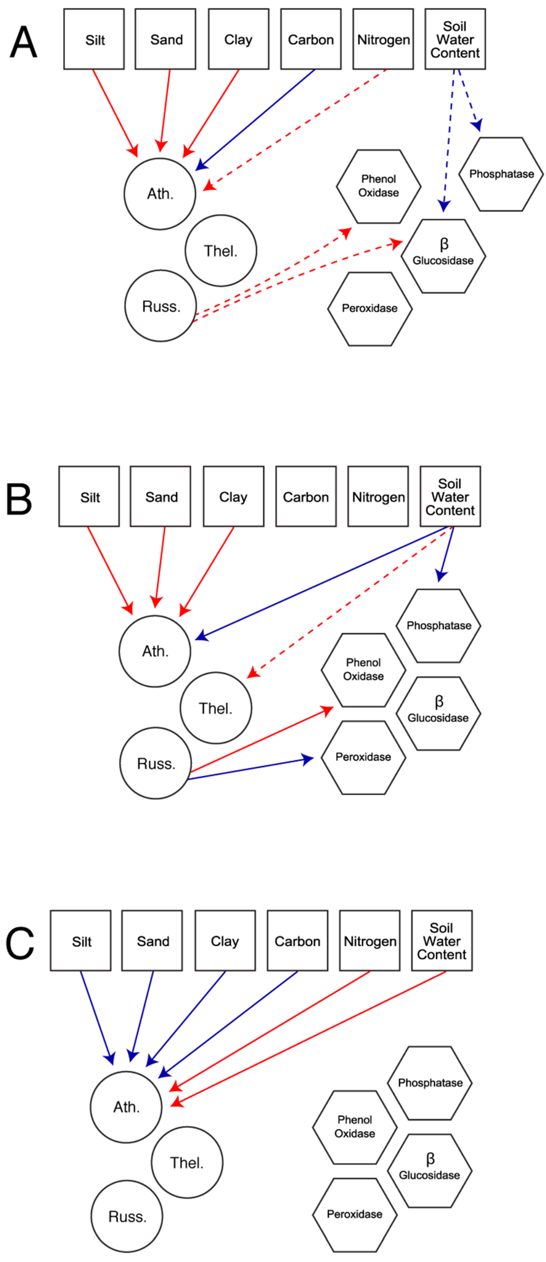 Most parsimonious piecewise structural equation model across sites (A); for the field only (B); and the forest only (C) exploring the effect of environmental variables (squares) on a subset of the ectomycorrhizal fungi community found across the ecotone (circles; Ath. = Atheliceae, Russ. = Russulaceae, Thel. = Thelephoraceae) or extracellular enzymes (hexagons). Enzymes could also be directly modified by environmental variables. Arrows indicate direction of effect. Only significant interaction pathways are represented. Solid lines indicate pathways significant at p < 0.05 while dashed lines indicate pathways significant at p < 0.1. Red lines indicate positive interaction pathways while blue lines represent negative interaction pathways. Estimates, standard error, and p-values associated with each pathway are found in Table 2 and Table 3.