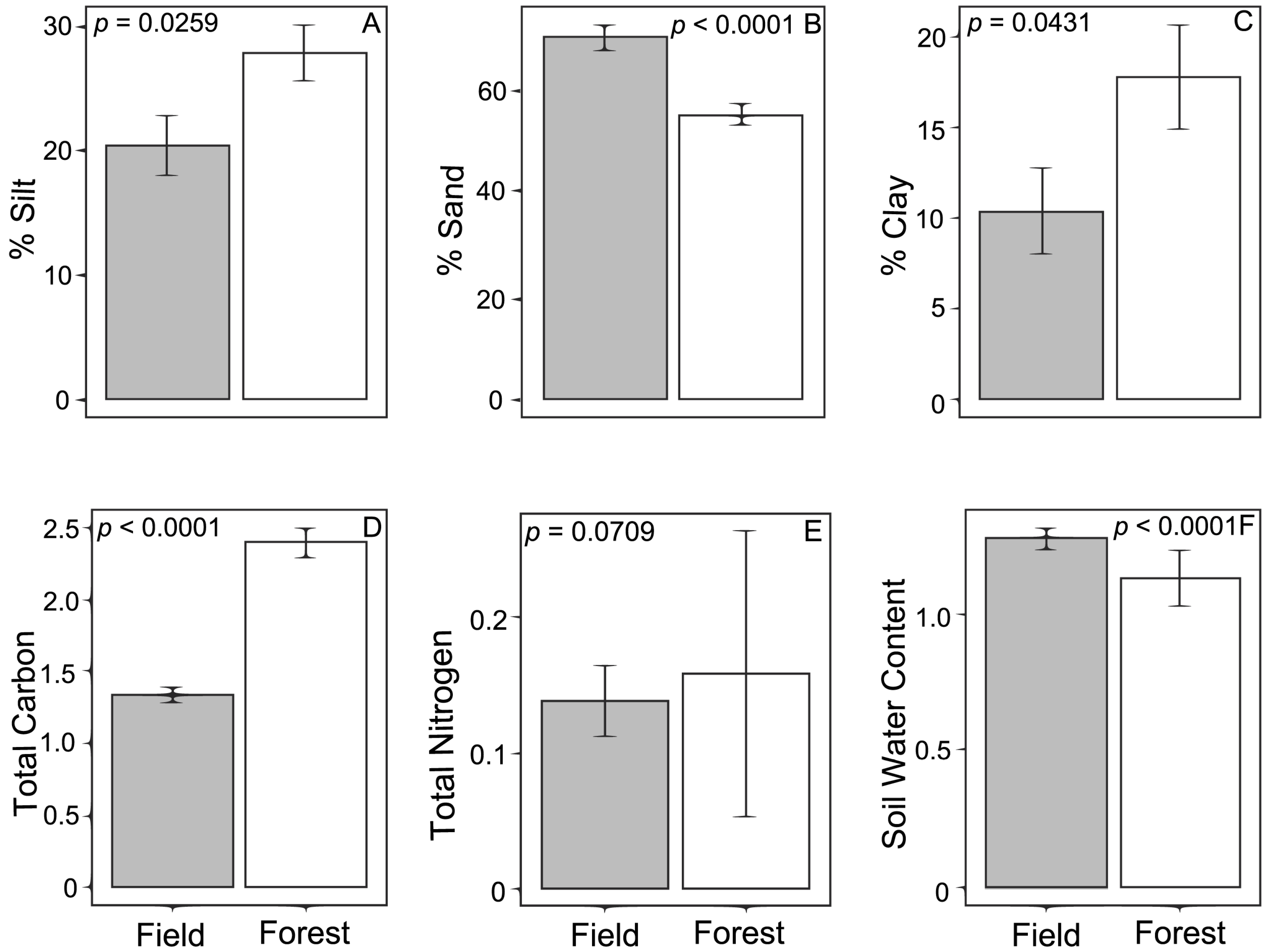 Soil characteristics for samples taken underneath loblolly pine (Pinus taeda) across an ecotone between forest and field habitats in north Mississippi, USA. Values represent the mean ± standard error for % silt (A), % sand (B), % clay (C), total Carbon (%) (D), total Nitrogen (%) (E) and soil water content (g water/g dry soil) (F) by the forest (white bars) and field (gray bars). Associated p-values are from linear models examining environmental characteristics as a function of location.