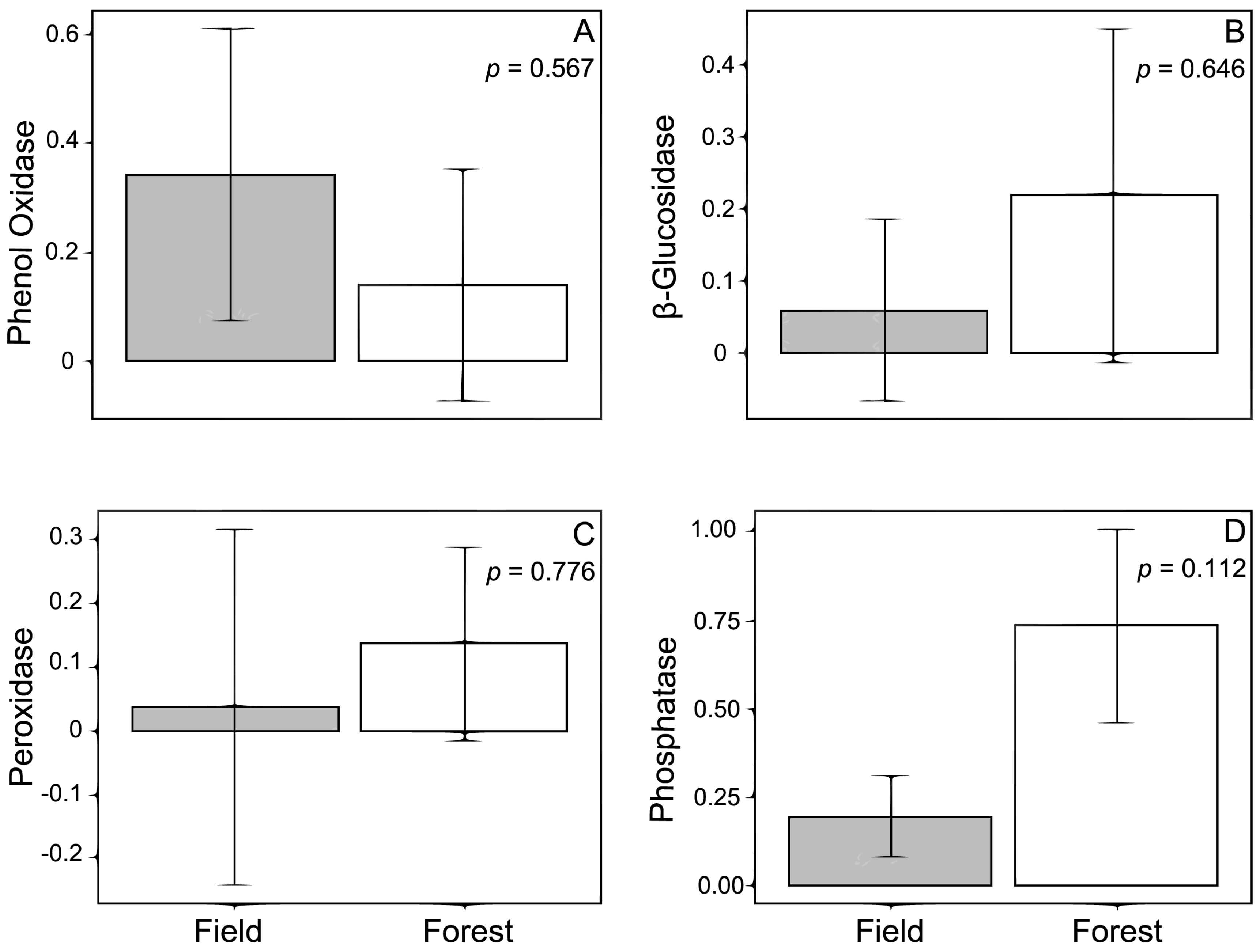 Linear models indicate that the forest and field sites did not significantly differ in the activities of the enzymes we measured (Figure 5): phenol oxidase (p = 0.567), peroxidase (p = 0.776), β-glucosidase (p = 0.646) and phosphatase (p = 0.112).