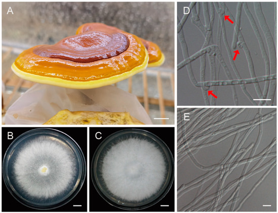 The fruiting bodies of Ganoderma leucocontextum and the monokaryotic strain used for genome sequencing. (A) The cultivated fruiting body of G. leucocontextum. (B,D) Colony and heterokaryotic mycelia with clamp connections. Red arrows indicated the clamp connections. (C,E) Colony and vegetative mycelia of the monokaryotic strain GL72. Bars: (A–C) = 1 cm; (D,E) = 10 μm.