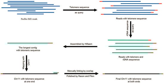 To patch the missing telomeres, a manual identification process was conducted on telomeric reads (Figure 2). Specifically, six-base telomere repeats (‘CCCTAA’ and ‘TTAGGG’) were employed as queries to extract pertinent sequences from PacBio HiFi reads. The extracted sequences were reverse-complemented and consolidated into a comprehensive library. The specific sequences associated with the absent telomeres were detected from the library. Subsequently, these identified sequences were employed for assembly using Hifiasm with default parameters, and based on the assembly results, the telomere-missing chromosomes were completed. Both Racon [] and Pilon [] were utilized in three iterative rounds of polishing. This iterative process involved refining the consensus sequences and resolving any potential errors, resulting in an improved assembly quality.