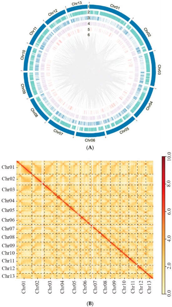 A heatmap generated from Hi-C data indicated that all bins could be categorized into 13 chromosomes (Figure 3B). In each group, the interaction intensity at the diagonal exceeded that of off-diagonal position, signifying strong interactions between adjacent sequences. No noticeable noise was observed outside the diagonal, indicating a satisfied genome assembly.