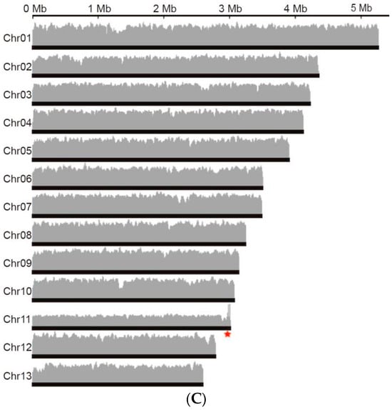 The final assembled genome had a size of 46.69 Mb with 13 chromosomes, exhibiting good continuity with an N50 value of 3.54 Mb (Table 1). The longest chromosome was 5.26 Mb, while the shortest was 2.59 Mb in length (Figure 4, Table S2).