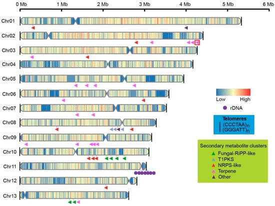 Chromosome structures, including the telomeres (black line), centromeres (indentations), and distribution of genes and secondary metabolite clusters on chromosomes of GL72. The triangular arrowheads indicated the secondary metabolite clusters while the unique clusters of G. leucocontextum were highlighted with a red frame.