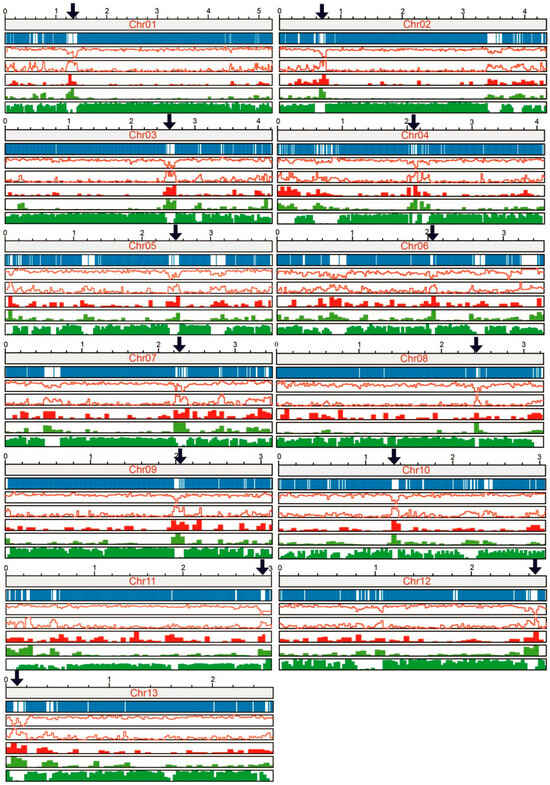 The specific characteristics of centromere regions. The top to the bottom showed the information of chromosome length (Mb), gene position, GC content, repeat sequences, DNA transposon, retrotransposon and read coverage in RNA-seq, respectively. The arrows indicated the predicted centromere region.