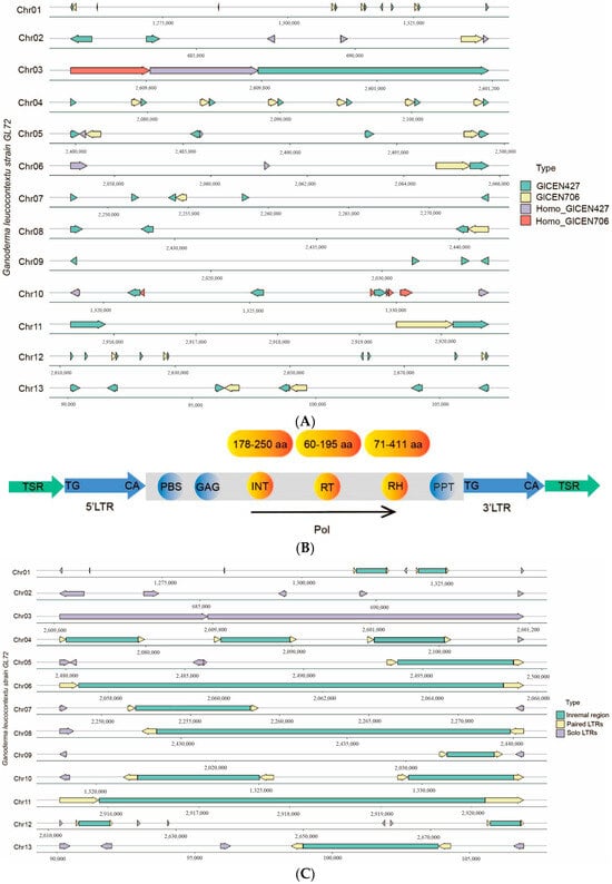 Furthermore, another set of conservative sequences, roughly 706 bp in length, was observed in the centromere regions of all the chromosomes with a copy number of 1–6 except Chr 09 (Figure 6A). A total of 22 GlCEN706 sequences and 5 shorter homologous sequences, were found across 13 chromosomes and they always accompany along with GlCEN427. GlCEN706 was also only located at our predicted centromeric regions. There were 1, 3, and 2 copies in Chrs 11, 12, 13, respectively (Figure 6A, Table S5). It was annotated as RH by alignment with the GyDB database []. Transcriptomic data suggested that they were not entirely in a silenced state (Table S6).