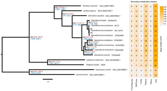 Phylogenomic analyses were conducted using 15 fungal genomes (Table S1), including two fossil record fungal species (Coprinopsis cinerea and Laccaria bicolor) []. Single-copy orthologous genes were identified using OrthoFinder version 2.5.4 []. Protein sequences of single-copy genes were aligned using Muscle version 3.8.31 [] with default parameters. The conserved sequences were selected using Gblocks version 0.91b [] and concatenated into supermatrix using seqkit version 2.2.0 []. A maximum likelihood-based phylogenetic tree was built using RAxML-NG version 0.9.0 [], with the amino acid replacement matrix LG + I + G + F, as selected by ProtTest version 3.4.2 []. One thousand bootstrap replicates were used, and the best tree was shown in FigTree v1.4.4 (https://github.com/rambaut/figtree/, accessed on 20 May 2023). The species divergence times were estimated by Beast version 2.67 [] with an approximate likelihood method based on fossil calibrations for L. bicolor and C. cinerea (59.3–108.4 MYA).