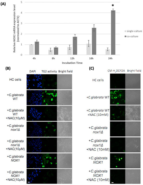 - Huang, Y.; Fujii, K.; Chen, X.; Iwatani, S.; Chibana, H.; Kojima, S.; Kajiwara, S. Fungal NOX Is an Essential Factor for Induction of TG2 in Human Hepatocytes. Med. Mycol. 2020, 58, 679–689. [Google Scholar] [CrossRef] [PubMed]
