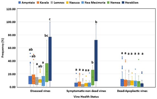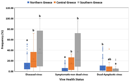 Grapevine trunk disease incidence (diseased, symptomatic/non-dead and dead/apoplectic vines) for vineyards located in different regions in Greece. Within the box, the median and the mean are represented by the solid line and the ‘X’, respectively. Top and bottom lines of the box correspond to the 25th and 75th percentiles of the data, respectively. Error bars represent the 10th and 90th percentiles. Within each group of plants, columns with the same letter do not differ significantly according to Kruskal–Wallis and Dunn’s test for multiple comparisons (p ≤ 0.05).