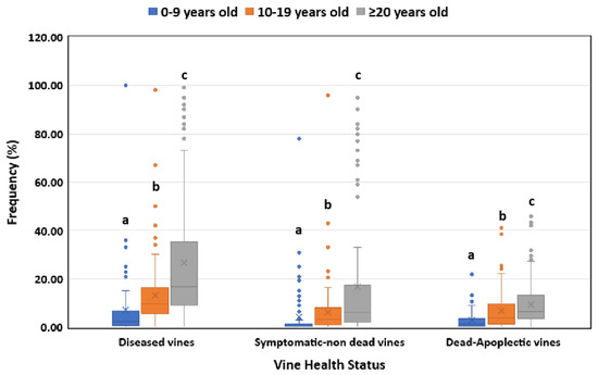 Grapevine trunk disease incidence (symptomatic/non-dead and dead/apoplectic vines) for young (0–9 years old), middle-aged (10–19 years old) and elder (≥20 years old) vineyards. Within the box, the median and the mean are represented by the solid line and the ‘X’, respectively. Top and bottom lines of the box correspond to the 25th and 75th percentiles of the data, respectively. Error bars represent the 10th and 90th percentiles. Within each group of plants, columns with the same letter do not differ significantly according to Kruskal–Wallis and Dunn’s test for multiple comparisons (p ≤ 0.05).