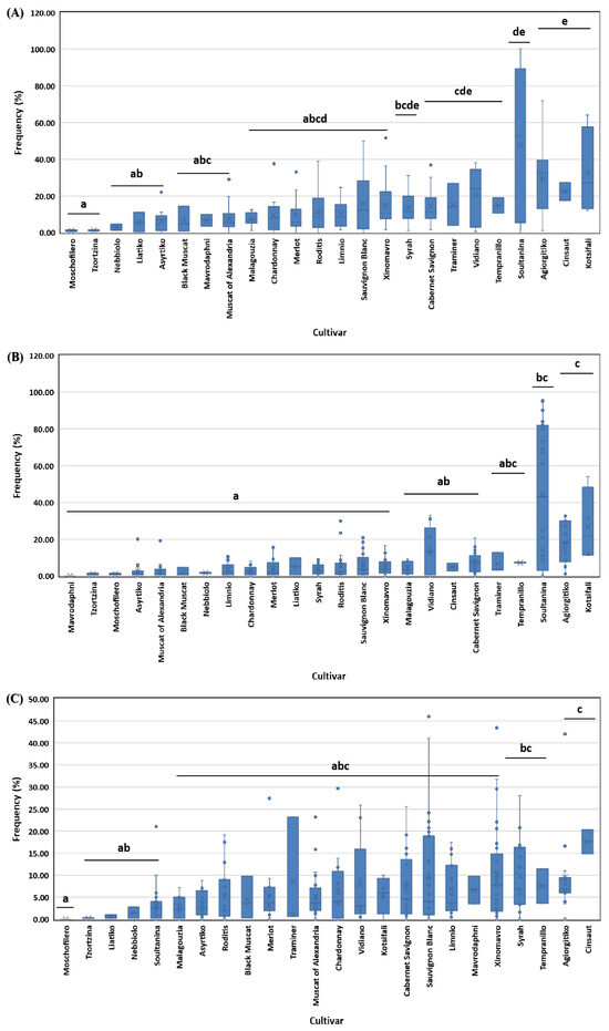 Frequency (%) of diseased (A), symptomatic/non-dead (B) and dead/apoplectic (C) vines on 24 grapevine cultivars grown in Greece. Within the box, the median and the mean are represented by the solid line and the ‘X’, respectively. Top and bottom lines of the box correspond to the 25th and 75th percentiles of the data, respectively. Error bars represent the 10th and 90th percentiles. Columns with the same letter do not differ significantly according to Kruskal–Wallis and Dunn’s test for multiple comparisons (p ≤ 0.05).