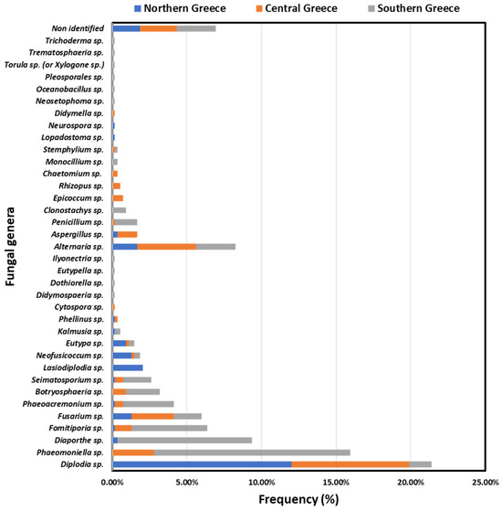 In total, 10 out of 18 genera were found at significantly different (p < 0.05) frequencies among the vineyards of the discrete zones. Furthermore, nine (9) genera were isolated at significantly different (p < 0.05) frequencies among the vines of discrete zones (Figure 8). Indicatively, the percentage of diseased vines that were infected by Diplodia spp. (mostly D. seriata) in northern Greece (58.33%) was significantly higher (p < 0.05) than that in central Greece (42.03%), while the percentage of Diplodia-infected vines in southern Greece (4.88%) was significantly lower (p < 0.05) compared to that in the other two zones. Contrariwise, the percentage of vines that were infected by Phaeomoniella sp. (P. chlamydospora) in southern Greece (28.46%) was significantly higher (p < 0.05) than that in central Greece (8.70%), whereas no Phaeomoniella-infected vines were found in northern Greece (0.00%) (Figure 8). Furthermore, 26.32% of the studied vineyards and 10.00% of the symptomatic vines were infected by Lasiodiplodia spp. (mostly L. viticola and L. theobromae) in northern Greece, exclusively (Figure 7 and Figure 8).
