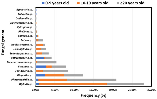 Frequencies of isolates belonging to 18 discrete fungal genera associated with grapevine trunk diseases, originating from young (0–9 years old), middle-aged (10–19 years old) and elder (≥20 years old) vineyards in Greece.