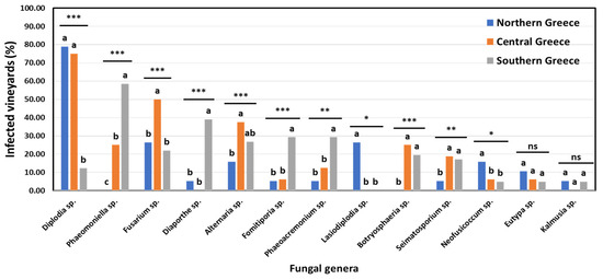Percentage of vineyards infested by each fungal genera in northern (Amyntaio and Kavala), central (Nemea) and southern (Heraklion) Greece. Within each genus, columns with the same letter do not differ significantly according to Chi-square test and a pair-wise comparison, whereas asterisks (*, ** and ***) indicate significance at p ≤ 0.05, 0.01 and 0.001, respectively. ‘ns’ indicates no significance.