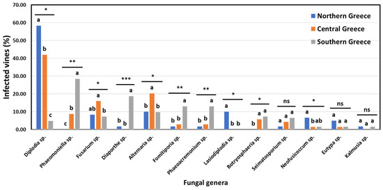 Percentage of vines infested by each fungal genera in northern (Amyntaio and Kavala), central (Nemea) and southern (Heraklion) Greece. Within each genus, columns with the same letter do not differ significantly according to Chi-square test and a pair-wise comparison, whereas asterisks (*, ** and ***) indicate significance at p ≤ 0.05, 0.01 and 0.001, respectively. ‘ns’ indicates no significance.