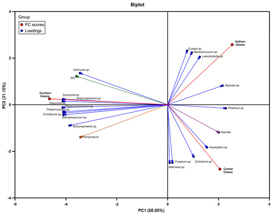 Principal component analysis (PCA) biplot illustrating the correlation between meteorological data (■ air temperature, ■ RH, and ■ rainfall) from past decades (2010–2020) and the identified fungal genera isolated from symptomatic grapevines in the viticultural zones of southern, central, and northern Greece.