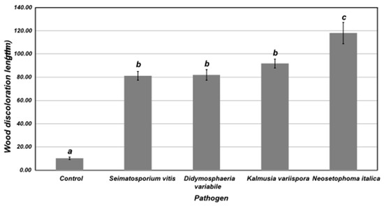 Length of vascular tissue discoloration in 2-year-old canes of cv. Soultanina 6 months after artificial inoculation with Seimatosporium vitis (isolate SARO1.3AVR10), Didymosphaeria variabile (isolate SARO1.2AKO1), Kalmusia variispora (isolate HOURD2.1AVR1) and Neosetophoma italica (isolate SARO1.3AVR7). Control canes (C-) were mock-inoculated with sterilized PDA discs. Columns followed by the same letter do not differ significantly according to Tukey significant difference test (p ≤ 0.05). Each column represents the mean of 20 canes and vertical bars indicate standard errors.