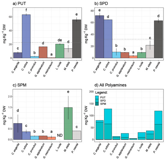 Polyamine content in analyzed fungal species—(a) putrescine (PUT), (b) spermidine (SPD), and (c) spermine (SPM)—as well as (d) total PAs. Different small letters indicate significant differences among different species; Tukey’s significant difference (HSD) post hoc test (p ≤ 0.05). Data represent the mean ± standard deviation (SD).
