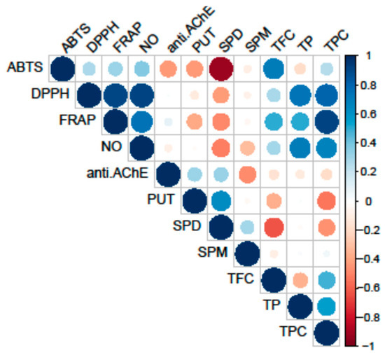 Pearson’s coefficient of the correlation matrix of the examined parameters in eight selected fungal species collected on the territory of the Republic of Serbia. Blue squares represent a highly significant correlation of inspected parameters, while red squares present low interactions, assessed according to the corresponding Pearson’s coefficient. The following are the abbreviations of the examined parameters: ABTS—radical scavenger capacity against 2,2′-azinobis(3-ethylbenzothiozoline)-6-sulfonic acid, ABTS•+; DPPH—radical scavenger capacity against 2,2-diphenyl-1-picrylhydrazyl radical, DPPH•; FRAP—ferric-reducing antioxidant power; NO—radical scavenger capacity against NO radical; anti.AChE—anti-acetylcholinesterase activity; PUT—putrescine; SPD—spermidine; SPM—spermine; TFC—total flavonoid content; TP—total protein content; TPC—total phenolic content.