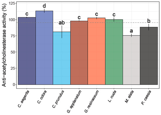 Anti-acetylcholinesterase activity of the eight analyzed fungal species. Different small letters indicate significant differences among different species; Tukey’s significant difference (HSD) post hoc test (p ≤ 0.05). Data represent the mean ± standard deviation (SD).