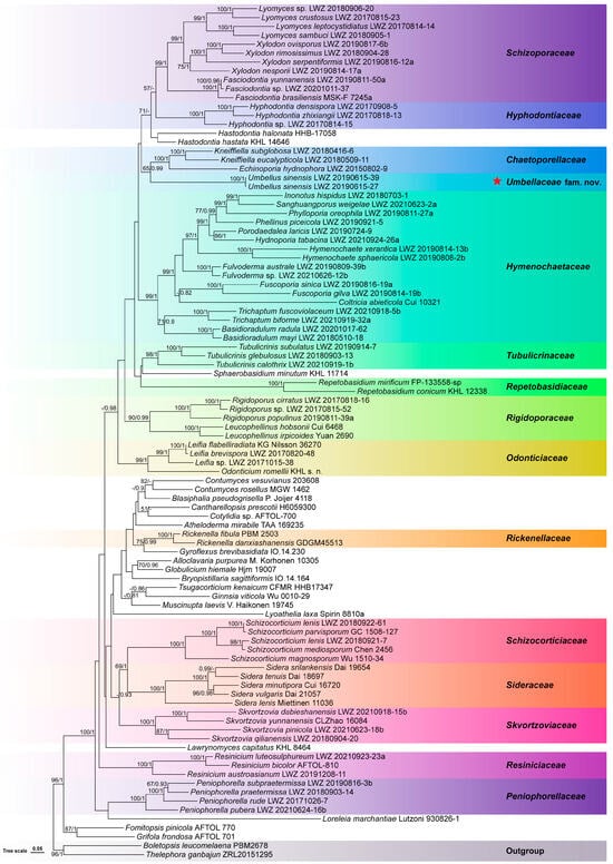 Phylogenetic position of Umbellaceae (marked with a red star) within Hymenochaetales, inferred from the combined dataset of nrSSU, ITS, nrLSU, mtSSU, and RPB2 regions. The topology has been generated using the maximum likelihood algorithm. The maximum likelihood bootstrap values and the Bayesian posterior probability values above 50% and 0.8, respectively are shown at the nodes. Boletopsis leucomelaena and Thelephora ganbajun from Thelephorales have been selected as outgroup taxa.