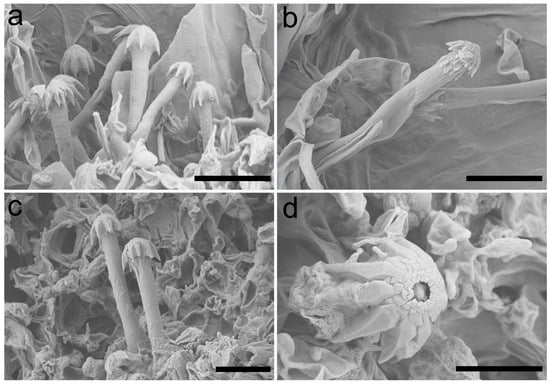 Scanning electron micrograph of cystidia of Umbellus sinensis. (a,b) LWZ 20190615-27 (holotype). (c,d) LWZ 20190615-39 (paratype). Scale bars: (a–c) = 10 μm, (d) = 5 μm.