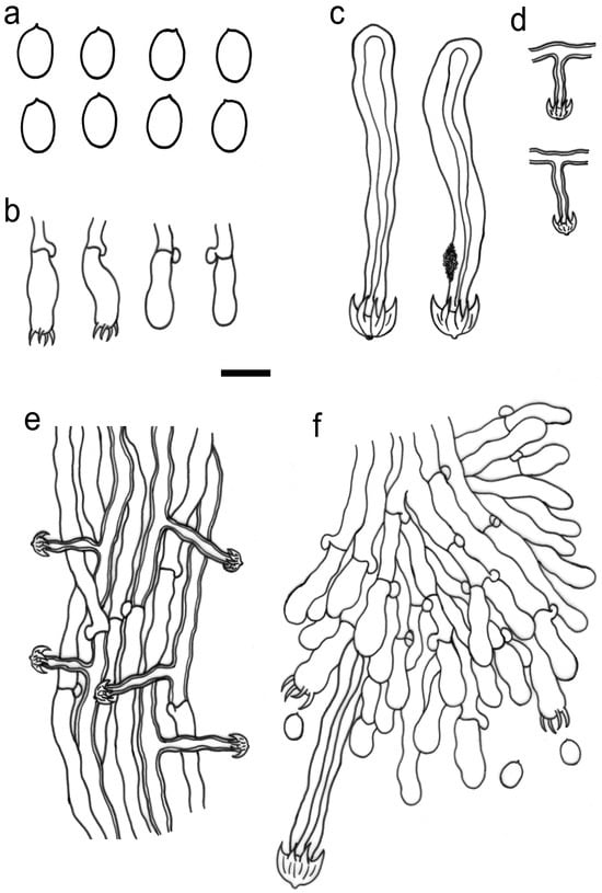 Microscopic structures of Umbellus sinensis (drawn from LWZ 20190615-27, holotype). (a) Basidiospores. (b) Basidia and basidioles. (c) Cystidia from the subhymenium. (d) Cystidia from subiculum. (e) Hyphae from subiculum. (f) A vertical section through hymenium. Scale bar: for (a) = 5 μm; for (b–f) = 10 μm.
