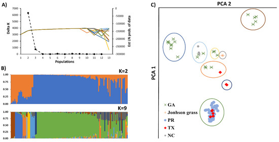 Population structure analysis of one hundred and thirty-eight C. sublineola isolates collected in sorghum fields in Georgia (GA), Texas (TX), North Carolina (NC), and Puerto Rico (PR) and two isolates collected from Johnsongrass in Corpus Christi, Texas, using 1244 SNPs. (A) Estimation of the number of populations in the 140 C. sublineola isolates based on the analysis in STRUCTURE, with Δk values (Axis 1; black dashed line) and the estimate LN probability of data (axis 2; different color line per each STRUCTURE run) using 10 runs for each K values from 1 to 13; (B) Hierarchical organization of genetic relatedness of 140 C. sublineola isolates for K values of 2 and 9. (C) Principal component analysis of the 105 C. sublineola isolates present in the eight populations found in the STRUCTURE analysis.